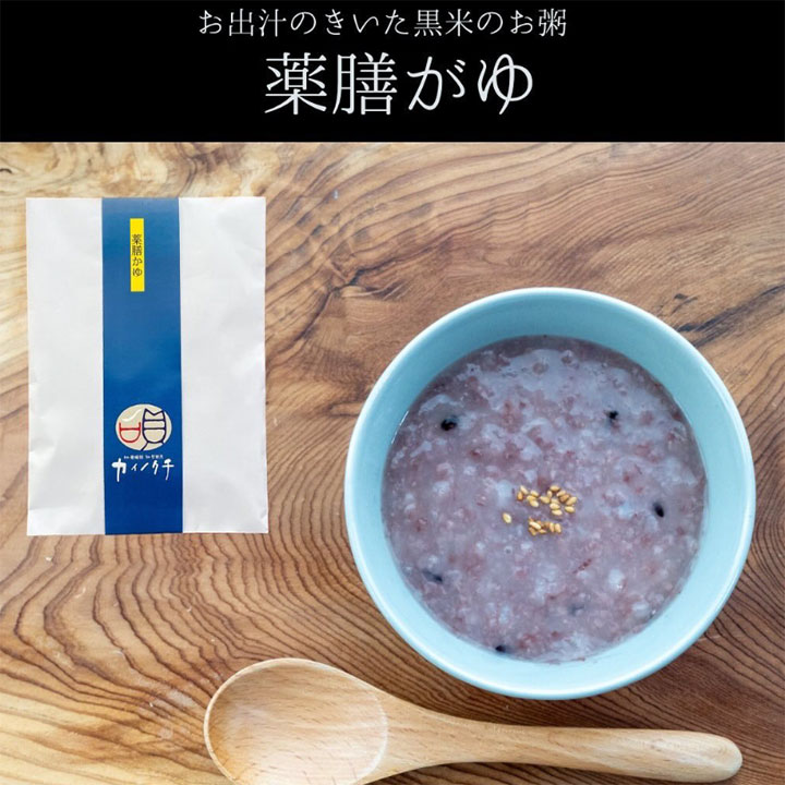 黒米(古代米)を入れていますので綺麗な赤紫色をしています。体調を整えたい時や、お夜食など小腹が空いた時におすすめの罪悪感のないお粥です。