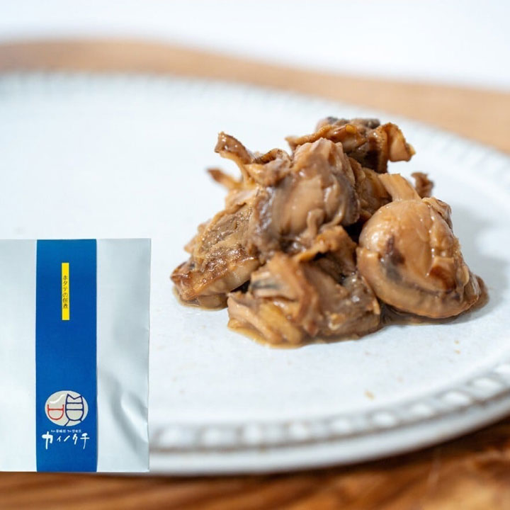 ホタテの旨味がギュッと詰まったホタテの佃煮。100%大将が手作りしたものを自社でレトルトパックにしておりますので、お店の味をそのままご自宅でもお楽しみいただけます。
